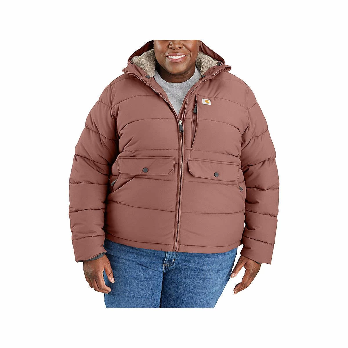 Ready to tackle the coldest winters, the Curvy Women’s Montana Relaxed Fit Insulated Hooded Jacket from Carhartt is the reliable outerwear you’ll love to zip into! Rain Defender® technology makes sure that you stay dry while Wind Fighter® tames the elements to keep you comfortable. The sherpa-lined body of this incredible utility coat is extremely cozy and the attached hood is adjustable with a hidden drawcord. Cold weather doesn’t stand a chance when you wear this fantastic insulated jacket!