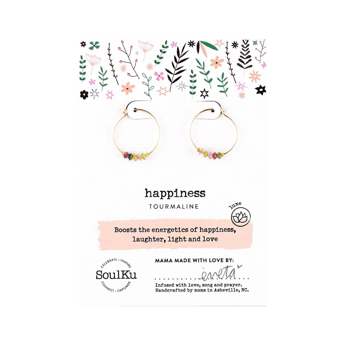 Stay stylish and centered with the Gold Hoop Earrings With Gemstones Collection from Soulku! These beautiful, 14k gold-filled hoop earrings have a classic style enhanced by 5 gemstone accents, such as rainbow tourmaline and moonstone, with various mindfulness benefits. Handmade in iconic Asheville, North Carolina, these stunning gold earrings will elevate your consciousness as well as your outfits!