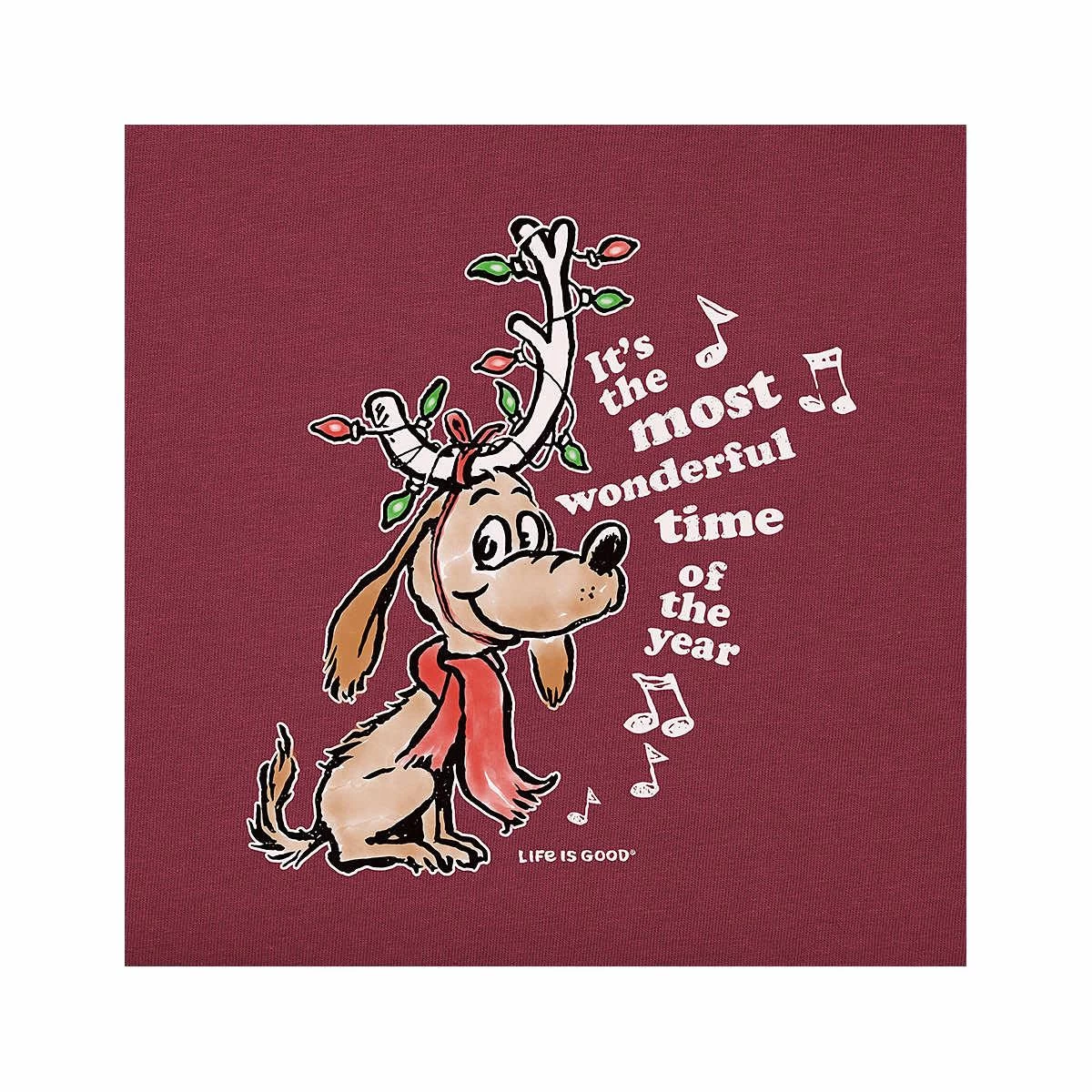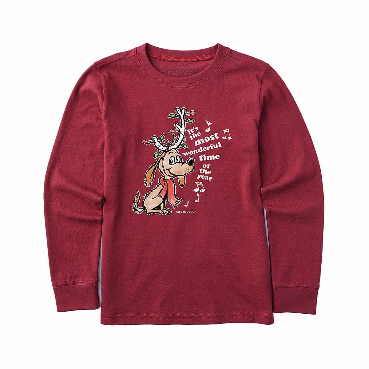 Everyone will know you’re of good cheer when you wear the Kids’ Max Most Wonderful Time Long Sleeve Crusher T-Shirt from Life is Good! This great tee is made with 100% cotton and garment-washed for softness, plus the neckline is reinforced with a spandex rib to maintain the perfect fit. The delightfully Seuss-ical graphic features the Grinch’s furry companion Max the Dog, adorned with Christmas lights. Tell some tales of the glories of Christmases long, long ago in this charming t-shirt!