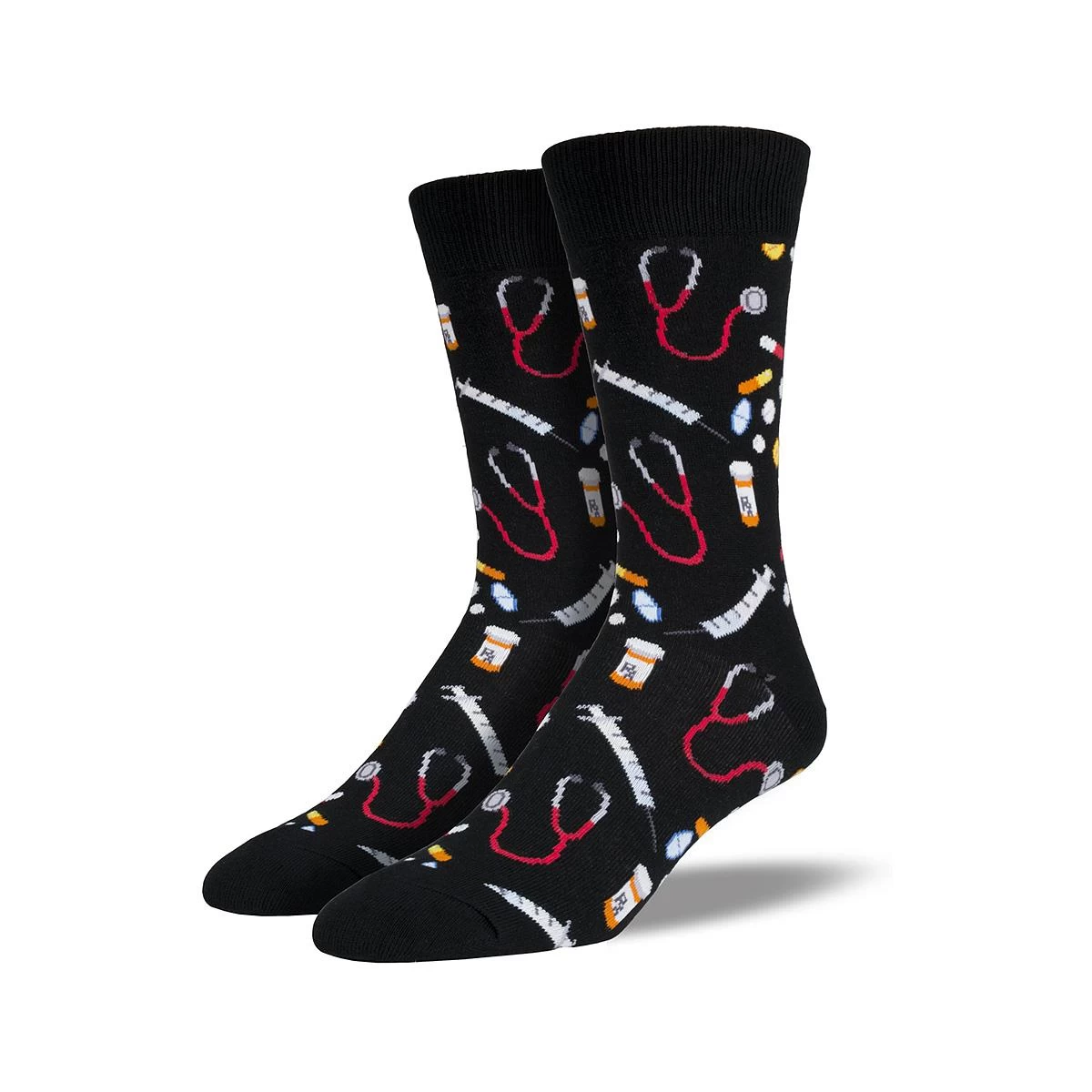Is there a doctor in the house?! Well, you don’t have to be a doctor—yet—to enjoy these Men’s Meds Socks from Socksmith. These crew socks are constructed from a comfy cotton/nylon blends and feature tablets, stethoscopes, prescription bottles, and syringes. They make the ideal gift for your favorite doctors, nurses, or medical enthusiast.