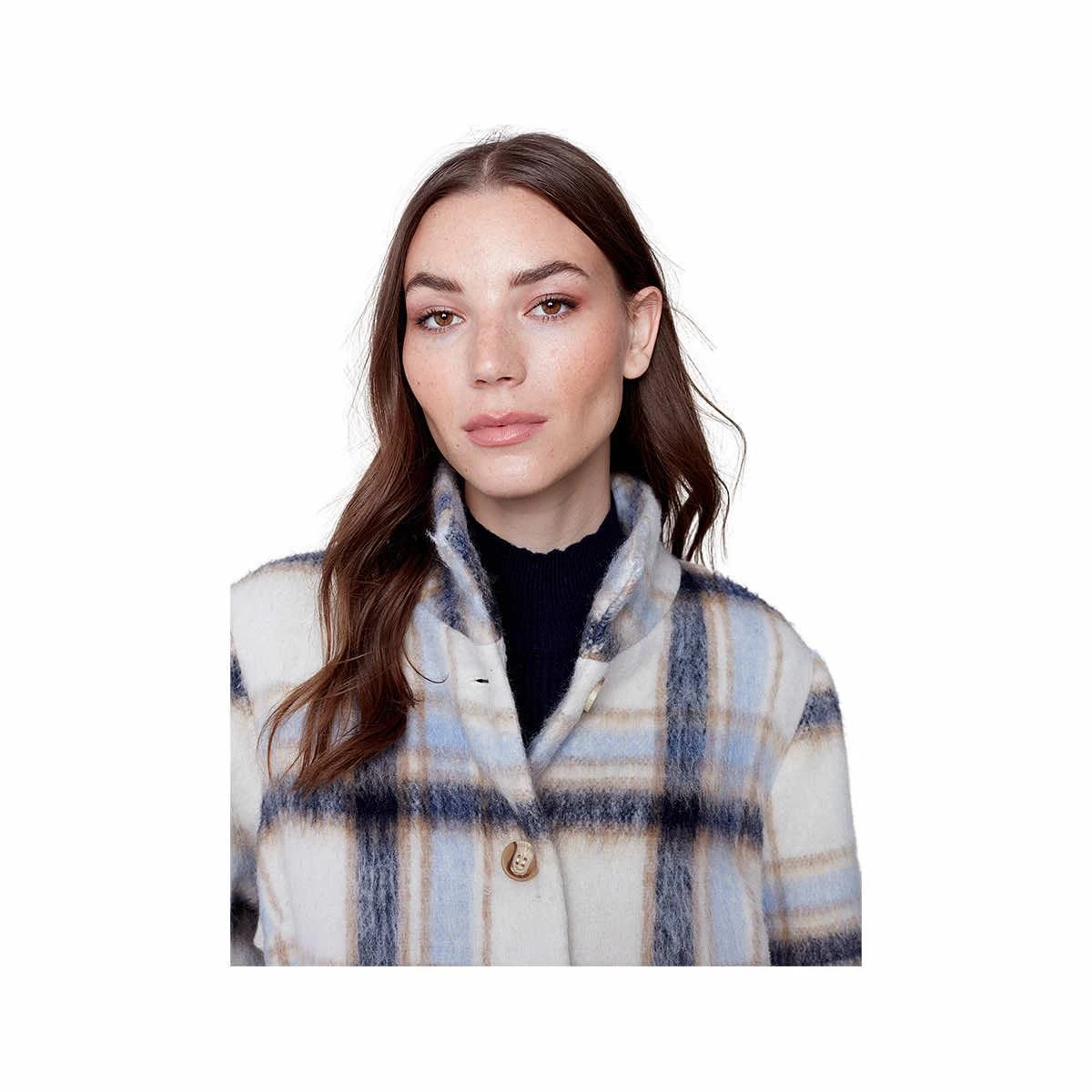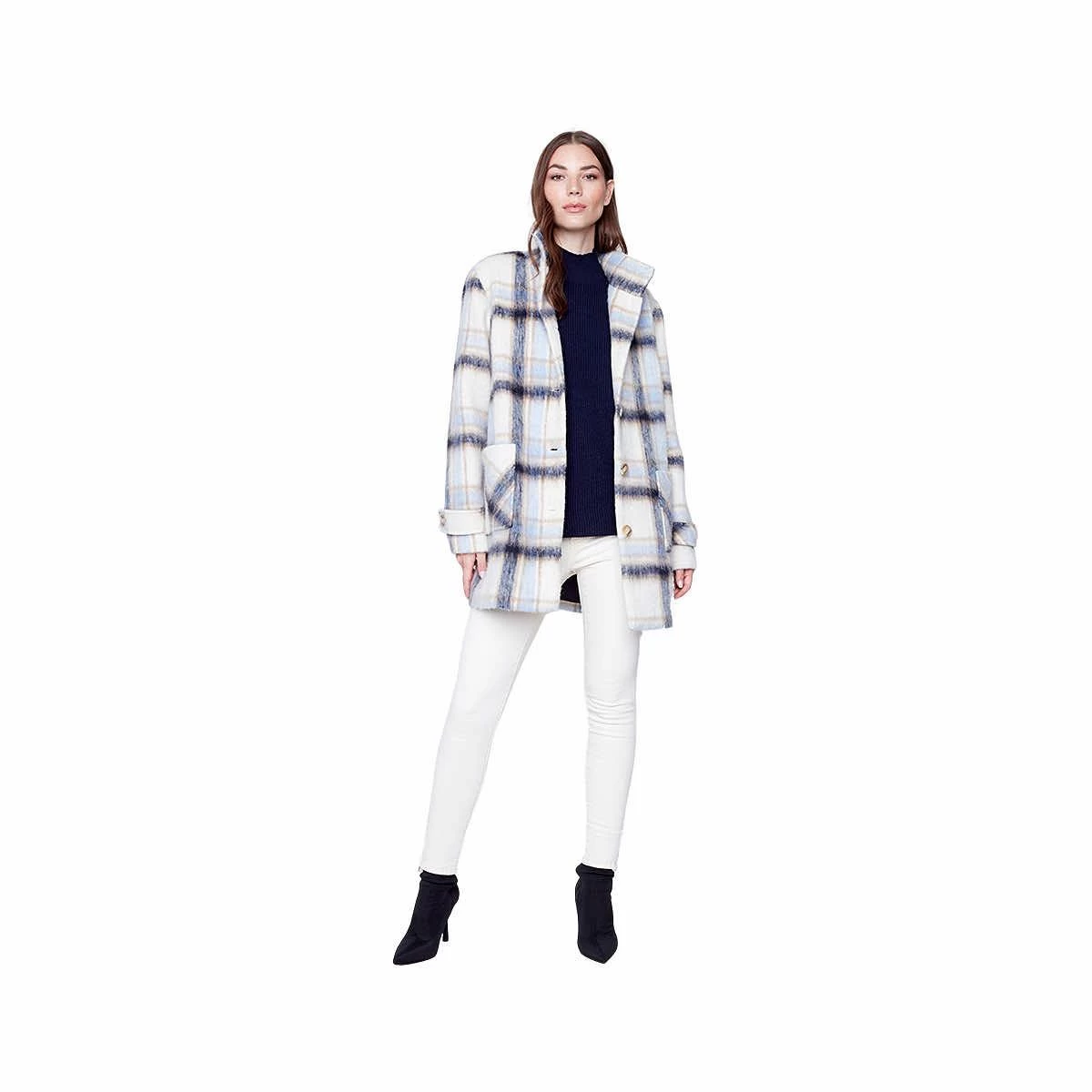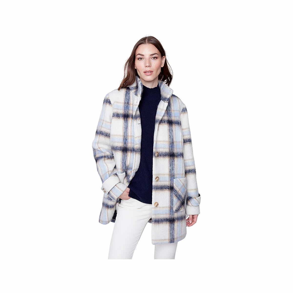 Sophisticated and stylish, the Women’s Plaid Brushed Wool Funnel Collar Coat from Charlie B is the cold-weather staple that will be turning heads all season long! The brushed texture of this polyester outerwear feels incredibly soft while the funnel collar keeps you cozy. The patch pockets hold your essentials or keep your hands toasty, plus button details at the back and cuffs give this coat a luxurious air. You’ll look like you stepped right out of a magazine when you wear this fabulous coat!