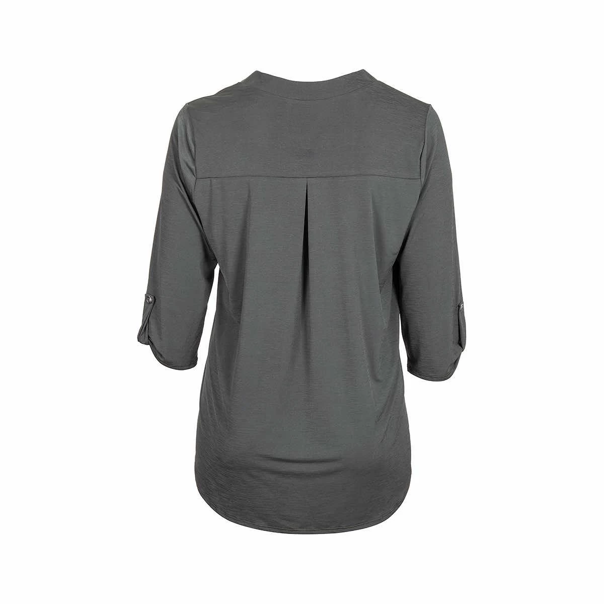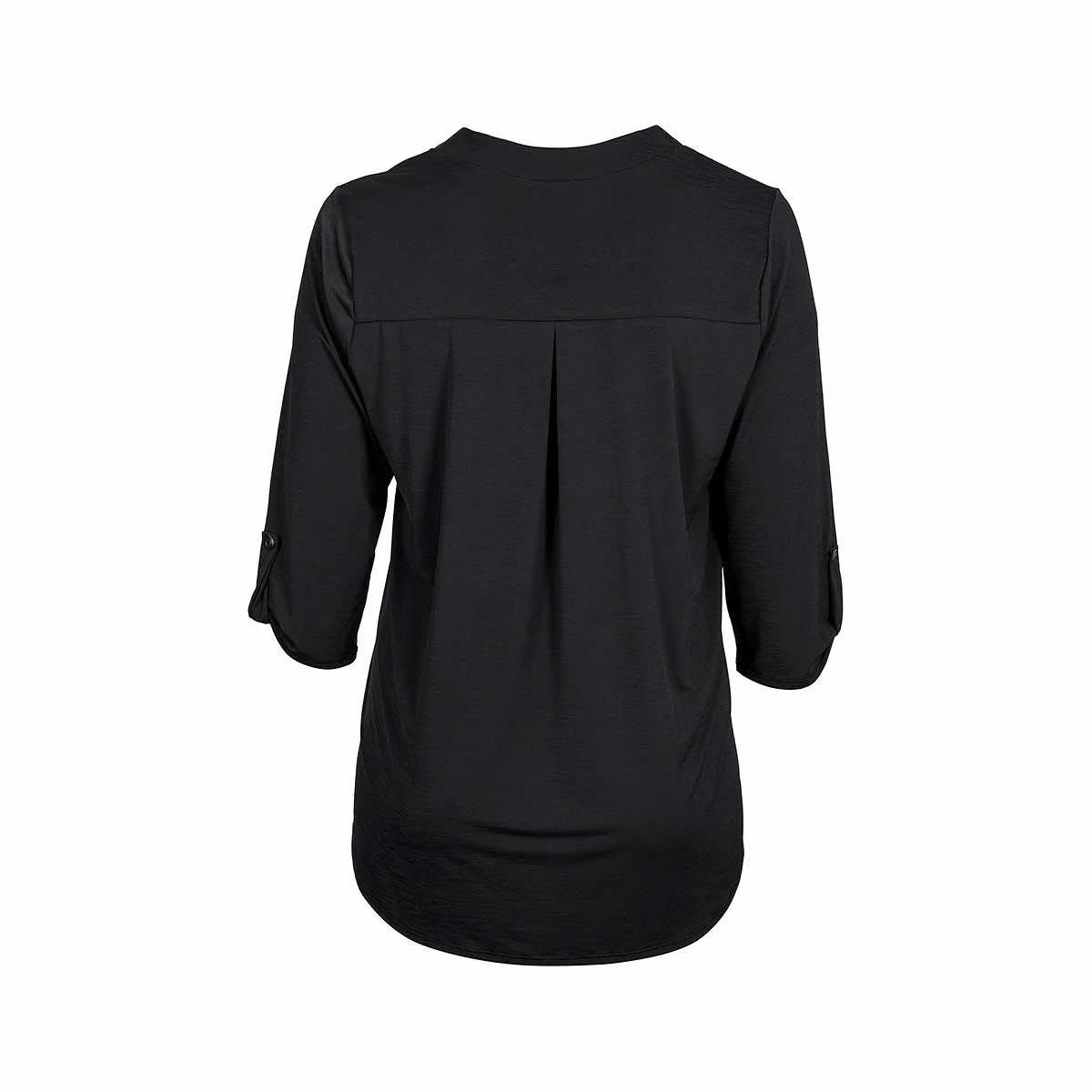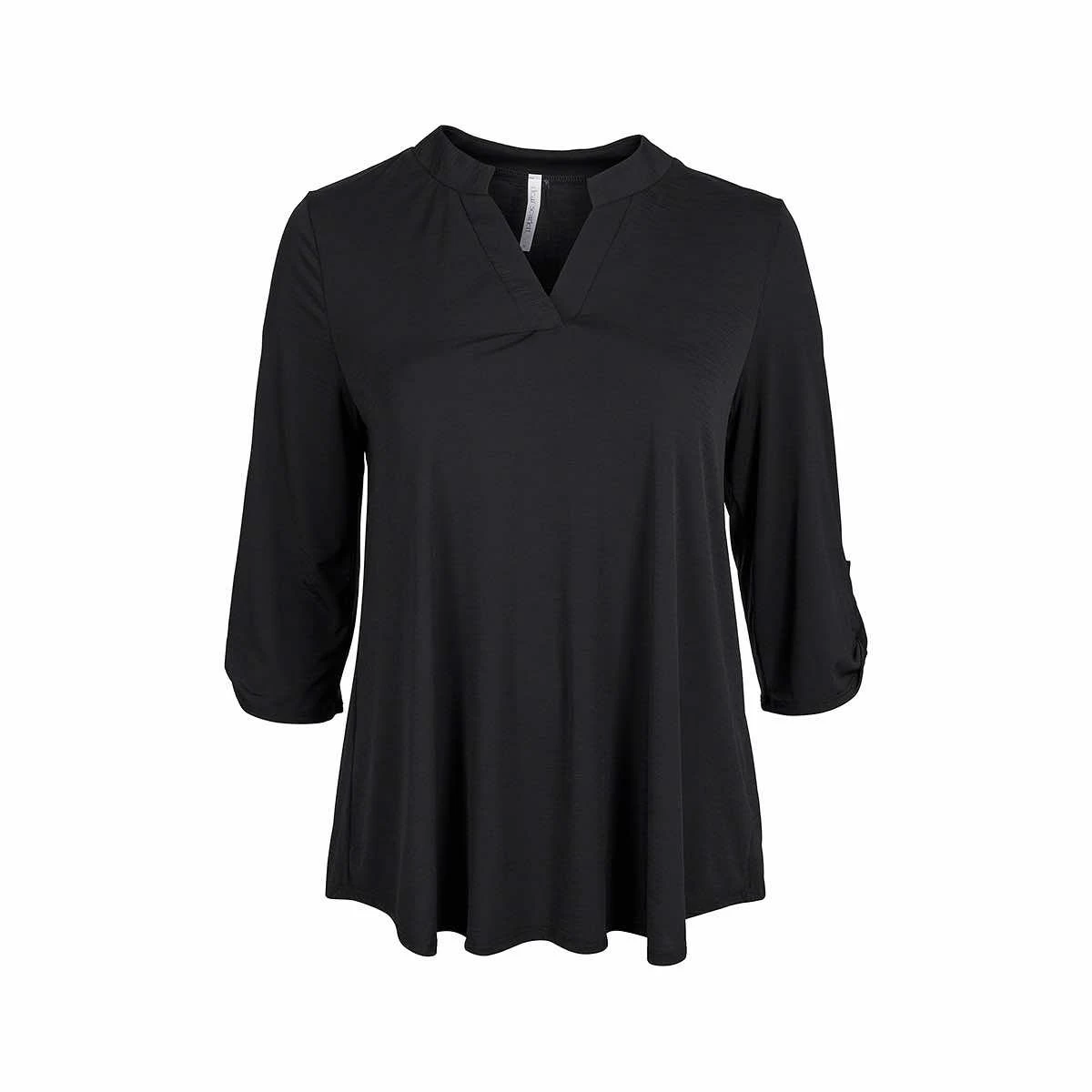 Andrée by Unit’s signature Curvy Women’s Solid Lizzy 3/4 Sleeve Top features a polyester blend that’s luxuriously soft with lightweight, wrinkle-free comfort. This easy-care fabric top is travel-friendly and cooler than linen and other materials which makes your perfect on-the-go wear. The Lizzy top also features a china collar neckline with 3/4 length sleeves with tab details. The fit is a relaxed, flowy fit with a slight high-low hemline.